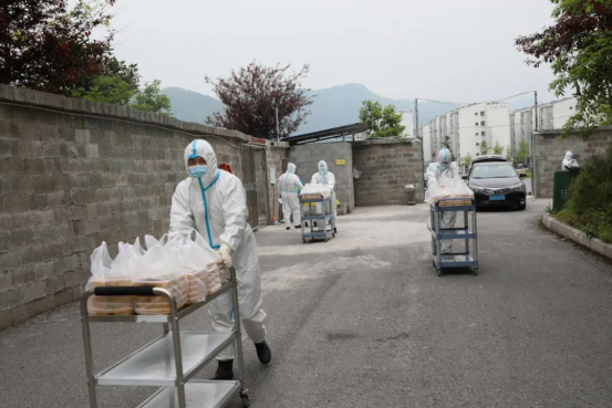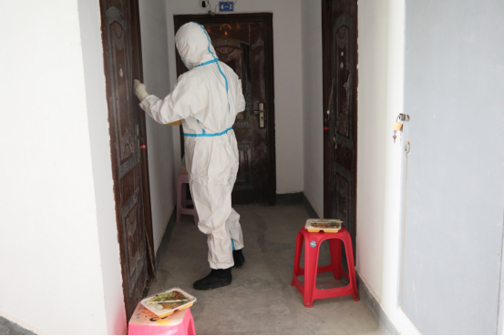 需求量大、時間緊張、人員緊張,平日里看似簡單的一日三餐,在這特殊時期成為一場嚴峻考驗。宴欲曉、劉堯等幾名工作人員在完成隔離點日常工作的同時,送餐服務成了工作量最大的事情,每餐要按時精準地將餐食送到被隔離人員,成了名副其實的送餐“服務員”。他們中年齡最大的晏欲曉53歲,最小的劉堯26歲,工作崗位不同、年齡不等,但都有著共同的心聲——像秒針一樣奔跑,送上熱乎飯。每人負責一棟樓的餐飲物資配送、垃圾收納轉運、環境衛生清掃、人員管理等工作。每天他們想的最多的就是“每日用餐人數必須準確、所用時間必須最快”。“我是當兵出身,最臟最累的活就交給我吧”,劉堯作為一名退役軍人,時刻保持軍人本色,他永遠都是竭盡全力做好每一項工作,用自己的汗水傳遞著正能量,無時無刻展示著退役軍人的風采。他們不管多臟、多難、多累,始終做到了用微笑和飽滿的熱情面對工作,為隔離點疫情防控工作提供了堅實的后勤保障。